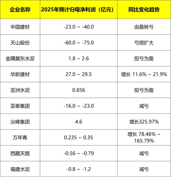近日,多家水泥企业2025年度业绩预报发布,具体见下: