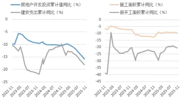 房地产开发端,1-11月房地产开发投资完成额同比下降15.9%,其中建安工程完成额下降18.2%,投资端特别是建安工程的大幅下滑拖累水泥用量走低。施工端看,新开工面积依然处于深降通道,1-11月份同比下降20.5%;或受竣工面积年内降幅扩大等影响,施工端整体同样不佳,同比下降9.6%。