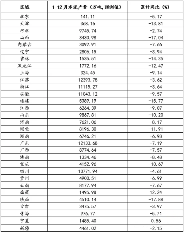 1-12月,31个省(市)中,水泥产量增长和下降的省(市)预计分别有2个和29个。: