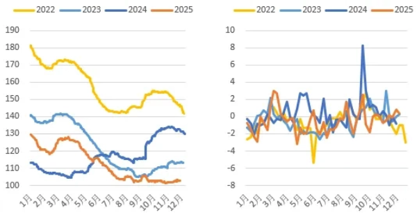 图9:2022~2025年各周价格环比(%):