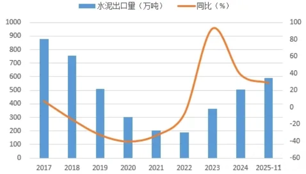 我国水泥出口量较少,主要以满足国内需求为主。2025年1-11月份,出口水泥591.4万吨,同比增长29%,尽管增长幅度较大,但绝对量相对国内产量来说仍偏低。