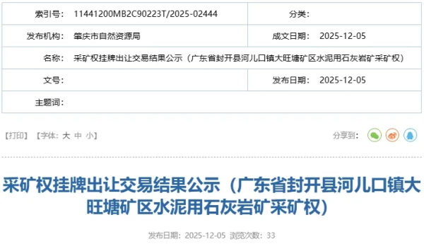 近日,广东省肇庆市自然资源局发布采矿权挂牌出让交易结果公示(广东省封开县河儿口镇大旺塘矿区水泥用石灰岩矿采矿权)显示,华润水泥(封开)有限公司以2.563亿元竞得上述水泥用石灰岩矿采矿权。