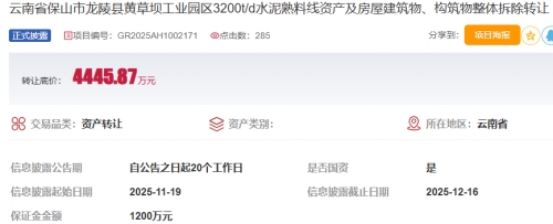 相关信息显示,云南省保山市龙陵县黄草坝工业园区3200t/d水泥熟料线资产及房屋建筑物、构筑物整体拆除转让,底价4445.87万元。