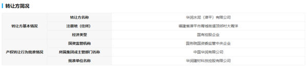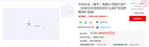 相关信息显示,华润水泥(漳平)有限公司转让石坂坑水泥用灰岩矿山采矿权及附属采矿设施,转让底价9544.864万元。