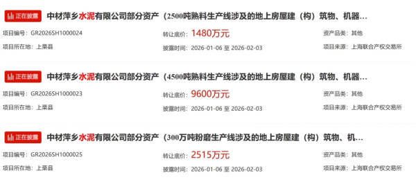 分别为2500t/d、4500t/d熟料生产线及300万吨粉磨生产线所涉及的地上房屋建(构)筑物、机器设备等资产,标的位于江西省萍乡市上栗县,转让底价共计13595万元。