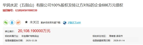 3.华润水泥(五指山)有限公司100%股权及转让方对标的企业686万元债权,转让底价为2.01亿元。