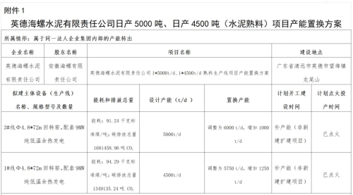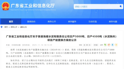 11月14日,广东省工信厅发布“关于英德海螺水泥有限责任公司日产5000吨、日产4500吨(水泥熟料)项目产能置换方案的公示”。