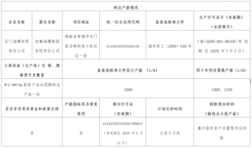 置换方案显示,石门海螺水泥退出一条4500t/d熟料生产线,其中1000t/d产能用于补充英德海螺3#线,补充后产能6000t/d;1250t/d用于1#线,补充后产能5750t/d,置换比例1:1。