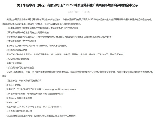 近日,华新水泥(黄石)有限公司11750t/d水泥熟料线项目环评公示。