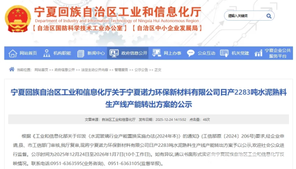 12月24日,宁夏工信厅发布“关于宁夏诺力环保新材料有限公司日产2283吨水泥熟料生产线产能转出方案的公示”。