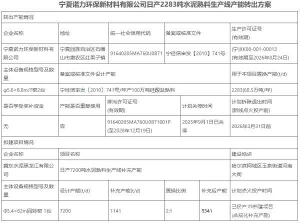 置换方案显示,宁夏诺力环保新材料退出2283t/d产能,用于补充冀东水泥黑龙江公司一条7200t/d熟料生产线,补齐后产能为8341t/d,置换比例2:1。