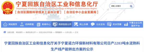 12月24日,宁夏回族自治区工业和信息化厅发布关于宁夏诺力环保新材料有限公司日产2283吨水泥熟料生产线产能转出方案的公示。