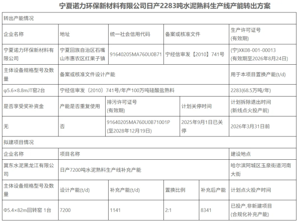 方案显示,宁夏诺力环保新材料有限公司出让2283t/d产能至冀东水泥黑龙江有限公司,用于补充7200t/d产能至8341t/d,置换比例2∶1。