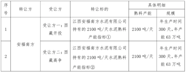 2025年12月30日,西藏开投海通水泥有限公司(简称“西藏开投”)、西藏高争建材股份有限公司(简称“西藏高争”)通过北京产权交易所有限公司公开摘牌的方式分别成为江西安福南方水泥有限公司熟料产能指标转让项目的受让方,成交价均为79元/吨,合计成交总金额为9,954万元。