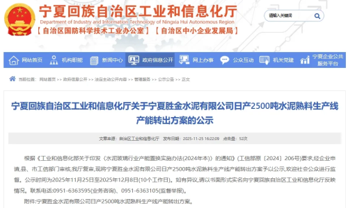 11月25日,宁夏工信厅发布“关于宁夏胜金水泥有限公司日产2500吨水泥熟料生产线产能转出方案的公示”。