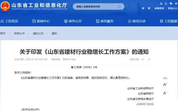 1月6日,山东省工业和信息化厅发布关于印发《山东省建材行业稳增长工作方案》的通知。