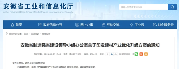 近日,安徽省制造强省建设领导小组办公室发布《建材产业优化升级方案的通知》。