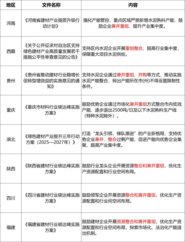 据了解,近年来,多地出台文件积极倡导并支持区域内水泥行业采取资源整合与兼并重组的策略整合行业内资源。