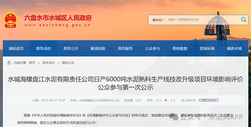 近日,贵州六盘水市水城区人民政府发布“水城海螺盘江水泥有限责任公司日产6000吨水泥熟料生产线技改升级项目环境影响评价公众参与第一次公示”。