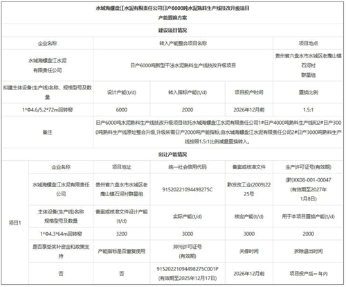 另据此前贵州工信厅发布,水城海螺盘江水泥6000t/d技改升级项目产能置换方案如下: