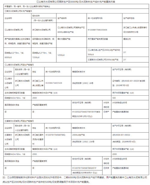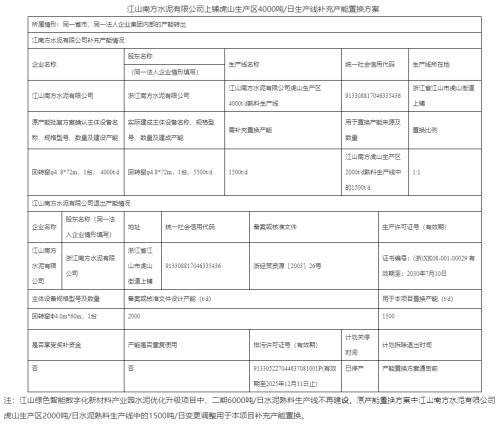 退出产能同样来自江山绿色智能数字化新材料产业园水泥优化升级项目,原产能置换方案中江山南方水泥有限公司虎山生产区2000t/d水泥熟料生产线中的500t/d变更调整用于本项目补充产能置换;及兰溪南方一条2000t/d熟料生产线,置换比例2:1。