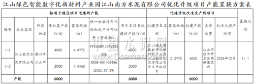 江山绿色智能数字化新材料产业园水泥优化升级项目中,二期6000t/d水泥熟料生产线不再建设,原产能置换方案中江山南方水泥有限公司虎山生产区2000t/d水泥熟料生产线中的1500t/d变更调整用于本项目补充产能置换。置换比例1:1。