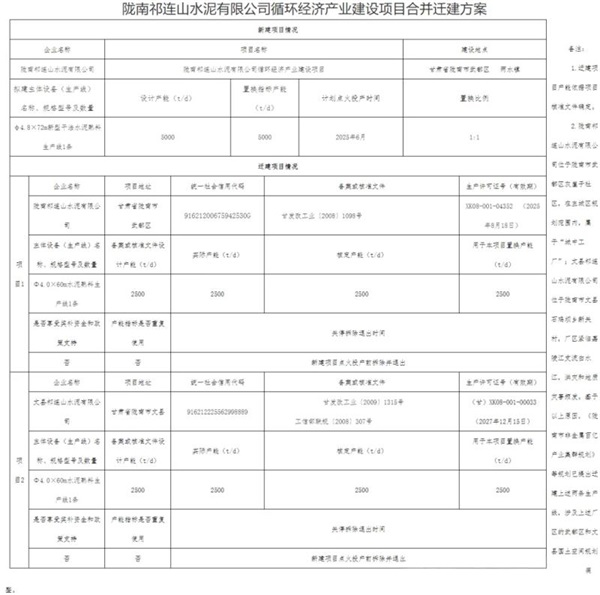 甘肃工信厅在公告中表示,陇南祁连山水泥有限公司位于陇南市武都区灰崖子社区,在主城区规划范围内,属于“城中工厂”;文县祁连山水泥有限公司位于陇南市文县石鸡坝乡新关村,厂区紧临嘉陵江支流白水江,洪灾和地质灾害频发。基于以上原因,《陇南市非金属百亿产业集群规划》等规划已提出迁建上述两条生产线,涉及上述厂区的武都区和文县国土空间规划已完成市级调整。