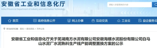 9月19日,安徽省工信厅发布关于芜湖南方水泥有限公司安徽海螺水泥股份有限公司白马山水泥厂水泥熟料生产线产能调整置换方案的公示。