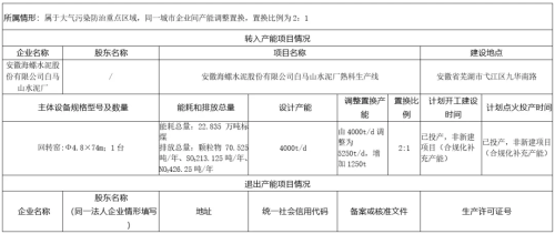 安徽海螺水泥股份有限公司白马山水泥厂拟将1条4000t/d水泥熟料生产线通过补产能方式增加到5250t/d,置换产能来自芜湖市华杨水泥有限责任公司(产能1250t/d)、芜湖瑞信水泥有限公司(1250t/d),置换比例为2:1。