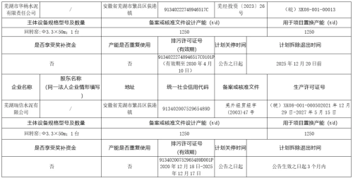 方案显示,芜湖南方水泥有限公司拟将2#、3#水泥熟料生产线(产能均为4500t/d)通过补产能方式分别增加到5700t/d、5800t/d,置换产能来自本企业1#水泥熟料生产线(产能为2500t/d),产能调整置换比例为1:1。