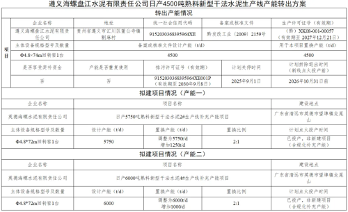 遵义海螺盘江水泥有限责任公司4500t/d熟料线出让2000t/d产能至英德海螺水泥有限责任公司4#生产线,补充产能至6000t/d,置换比例2∶1。