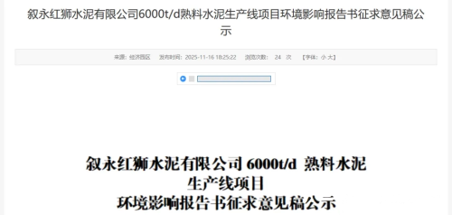 11月16日,四川省泸州市叙永县发布“叙永红狮水泥有限公司6000t/d熟料水泥生产线项目环境影响报告书征求意见稿公示”。
