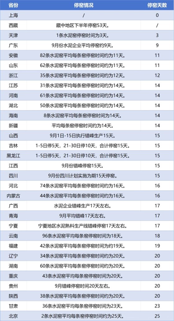 四川省每条熟料生产线四季度每月错峰停窑任务天数为“15+X”天;