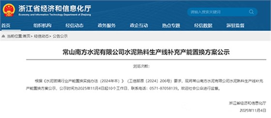 11月4日,浙江省经信厅发布“常山南方水泥有限公司水泥熟料生产线补充产能置换方案公示”。