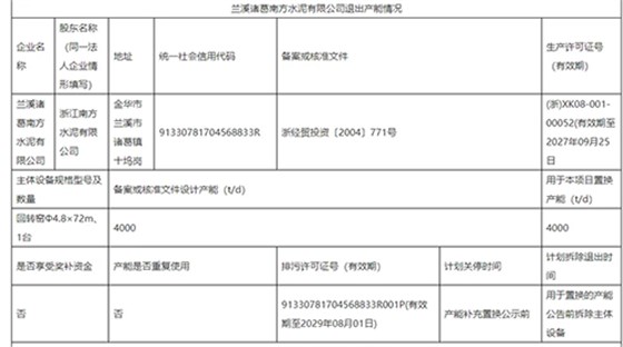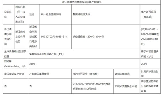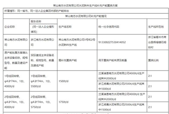置换方案显示,常山南方1号线回转窑补充熟料产能1500t/d,2号线回转窑补充熟料产能1750t/d,置换退出产能来自兰溪诸葛南方一条4000t/d熟料生产线及浙江虎鹰水泥一条2500t/d熟料生产线,置换比例2:1。