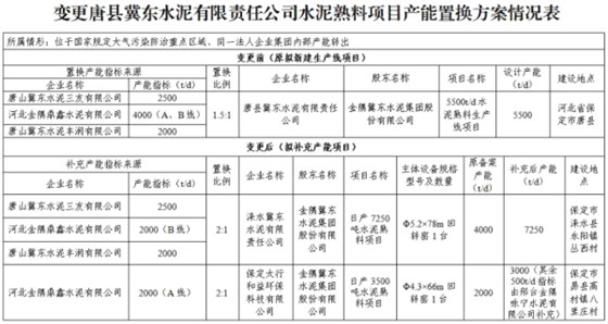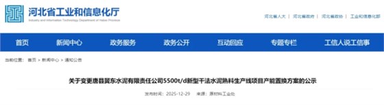 12月29日,河北省工信厅发布“关于变更唐县冀东水泥有限责任公司5500t/d新型干法水泥熟料生产线项目产能置换方案的公示”。