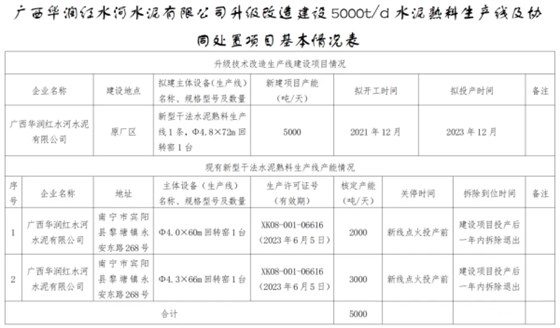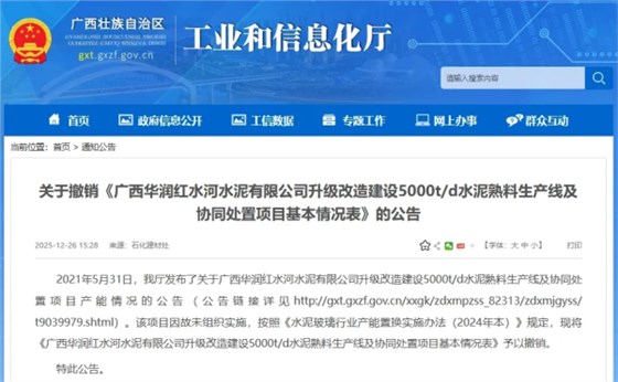 与此同时,据广西工信厅发布公告,广西华润红水河水泥有限公司升级改造建设5000t/d水泥熟料生产线及协同处置项目,因故未组织实施,现将该项目基本情况表公告撤销。