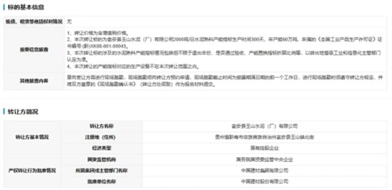 据悉,本次转让标的位于贵州省黔南布依族苗族自治州瓮安县,转让标的为瓮安县玉山水泥(厂)有限公司2000吨/日水泥熟料产能指标生产时间300天,年产能60万吨,本次转让的产能指标对应的生产设备不在本次转让范围之内。