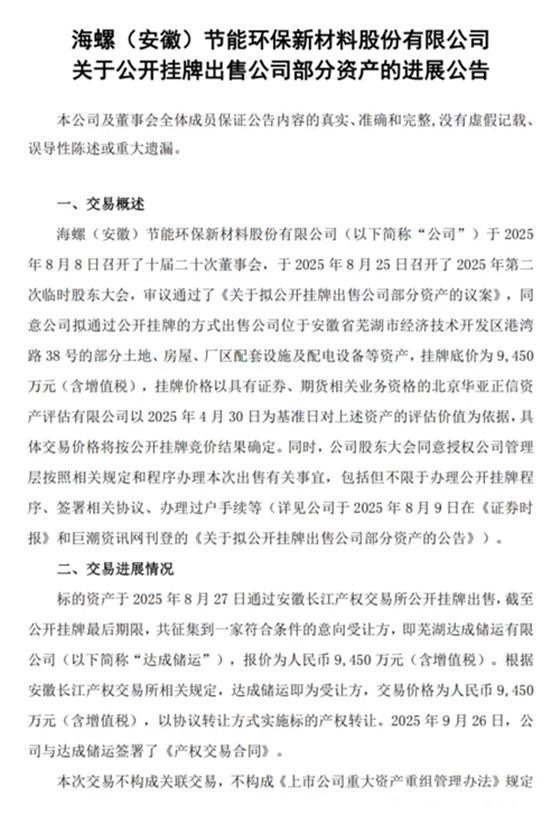 9月27日,海螺新材发布公告,公司公司位于安徽省芜湖市经济技术开发区港湾路38号的部分土地、房屋、厂区配套设施及配电设备等资产,以9450万元(含增值税)价格挂牌转让之后,到最后期限,共征集到一家符合条件的意向受让方,即芜湖达成储运有限公司,报价为人民币9,450万元(含增值税)。
