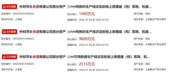 分别为2500t/d、4500t/d熟料生产线及300万吨粉磨生产线所涉及的地上房屋建(构)筑物、机器设备等资产,标的位于江西省萍乡市上栗县,转让底价共计13595万元。