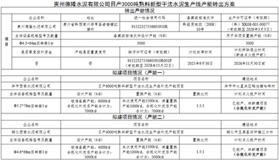 公示内容显示,现将贵州德隆水泥有限公司3000t/d水泥熟料线产能转出,置换比例1.5:1,用于毕节西南水泥有限公司拟建日产6000吨熟料新型干法水泥生产线补充产能项目;铜仁西南水泥有限公司日产4000吨熟料新型干法水泥生产线补充产能项目。