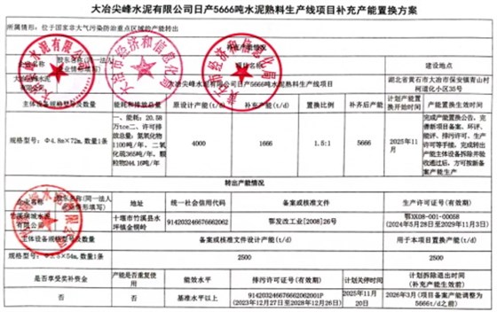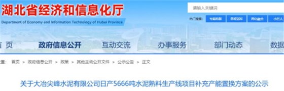 12月4日,湖北省经济和信息化厅发布关于大冶尖峰水泥有限公司日产5666吨水泥熟料生产线项目补充产能置换方案的公示。