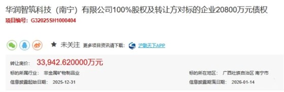 1.华润智筑科技(南宁)有限公司100%股权及转让方对标的企业20800万元债权,转让底价为3.39亿元。