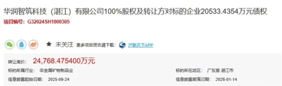 2.华润智筑科技(湛江)有限公司100%股权及转让方对标的企业20533.4354万元债权,转让底价为2.48亿元。