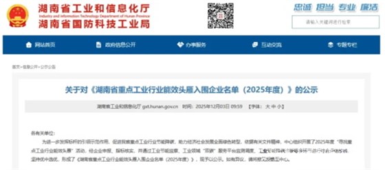 12月3日,湖南省工信厅发布“关于对《湖南省重点工业行业能效头雁入围企业名单(2025年度)》的公示”。