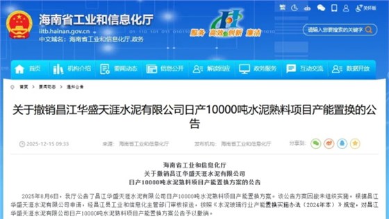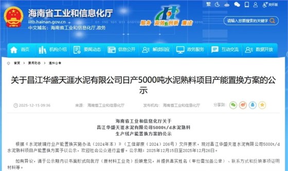 12月15日,海南工信厅发布昌江华盛天涯水泥两则产能置换公示。