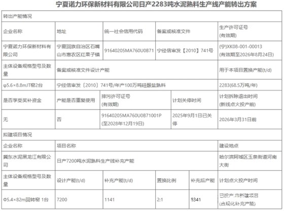 置换方案显示,宁夏诺力环保新材料退出2283t/d产能,用于补充冀东水泥黑龙江公司一条7200t/d熟料生产线,补齐后产能为8341t/d,置换比例2:1。