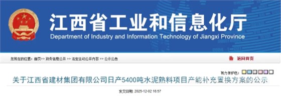 12月2日,江西省工业和信息化厅发布关于江西省建材集团有限公司日产5400吨水泥熟料项目产能补充置换方案的公示,公示时间为2025年12月2日至2025年12月15日。
