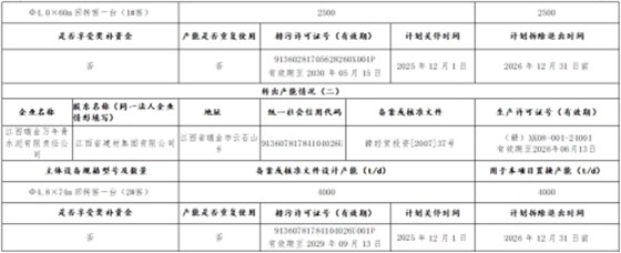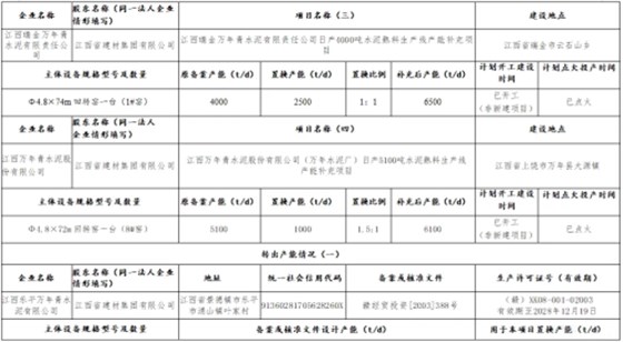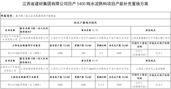 公示内容显示,江西省建材集团有限公司拟将下属成员企业江西乐平万年青水泥有限公司1#窑2500t/d水泥熟料产能,用于江西乐平万年青水泥有限公司、江西玉山万年青水泥有限公司两家企业2条水泥熟料生产线进行补充产能,置换比例分别为1︰1和1.5︰1,分别补充江西乐平万年青水泥有限公司2#窑700t/d水泥熟料产能、江西玉山万年青水泥有限公司1#窑1200t/d水泥熟料产能;