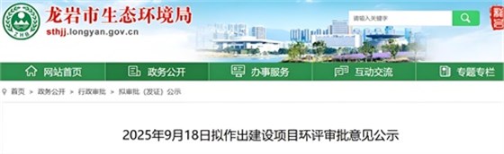 近日,福建省龙岩市生态环境局发布建设项目环评审批意见公示。